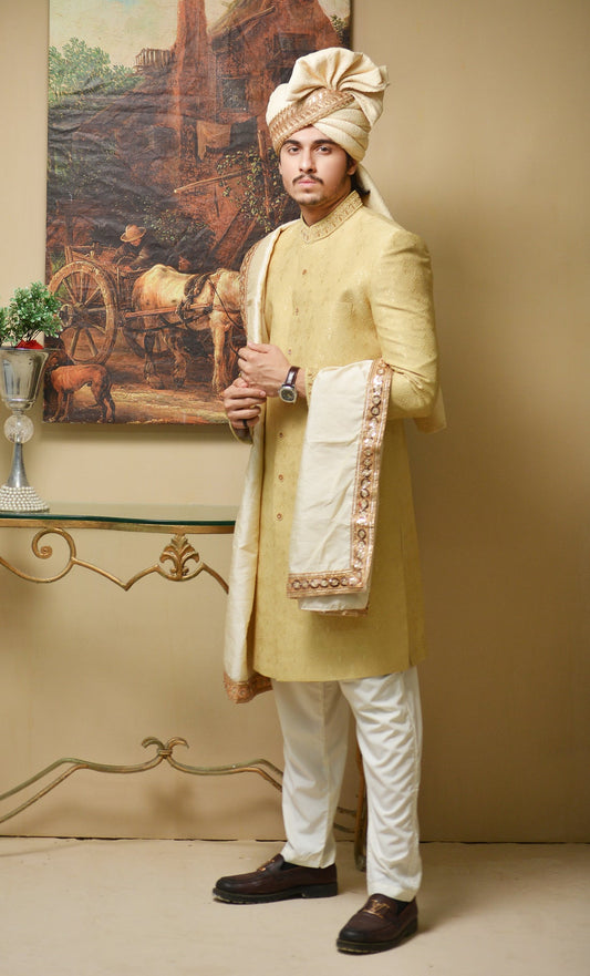 Regal Golden Sherwani Set with Hand-Embroidered Shawl & Accessories