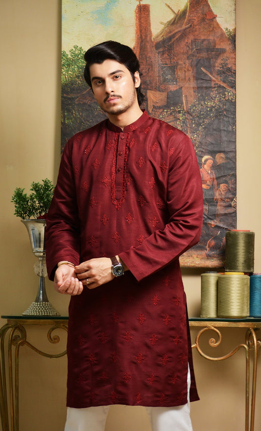 Maroon Embroidered Kurta with White Trousers